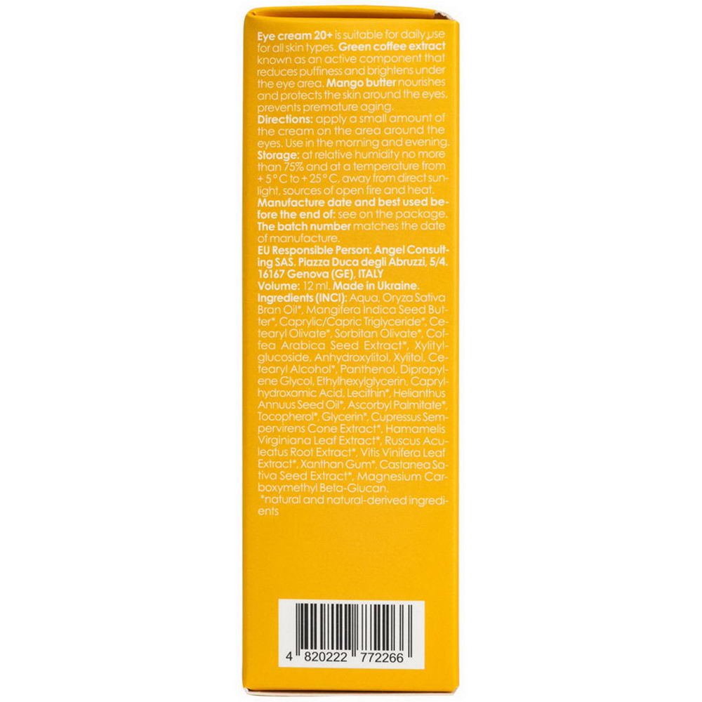 КРЕМ ДЛЯ ПОВІК 20+ Крем для повік 20+ підходить для щоденного використання. Екстракт зеленої кави освітлює шкіру навколо очей та зменшує набряки. Батер манго живить шкіру та запобігає появі зморщок. Комплекс полісахаридів забезпечує оптимальний рівень зволоженості шкіри протягом 12 годин.
