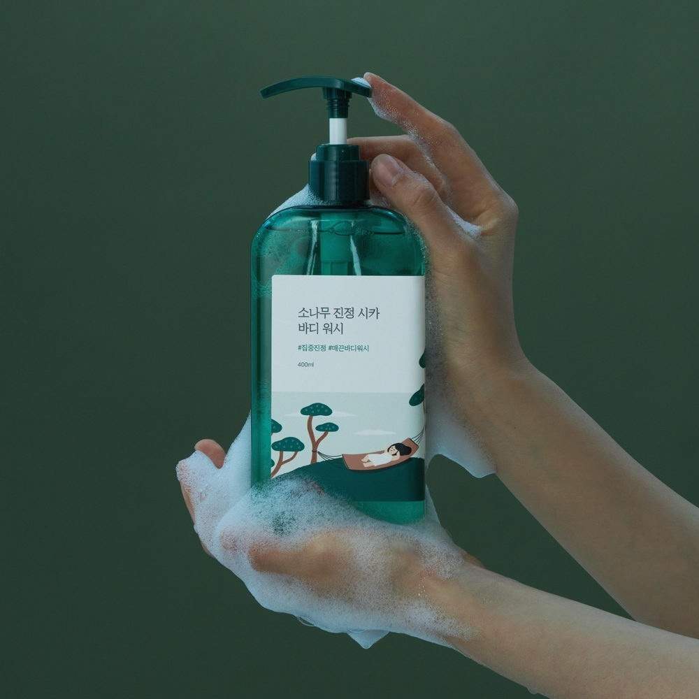 ROUND LAB Pine Calming Cica Body Wash — гель для душу, який глибоко зволожує та заспокоює шкіру. Допомагає зменшити кількість висипань на тілі, оздоровлює шкіру, робить її м’якою та гладенькою. Утворює щільну піну, глибоко проникає в пори та ретельно видаляє забруднення. Після змивання залишає відчуття зволоження та свіжості. Підходить для будь-якого типу шкіри, зокрема, для чутливої. Пройшов тест на подразнення шкіри.