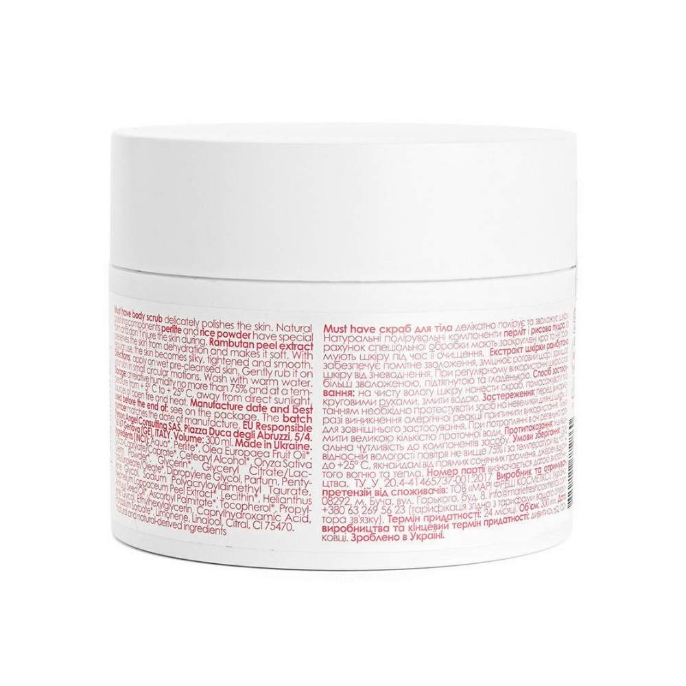 СКРАБ ДЛЯ ТІЛА MUST HAVE Скраб делікатно полірує та зволожує шкіру. Натуральні полірувальні компоненти перліту та рисової пудри завдяки спеціальній обробці мають заокруглені краї, що дозволяє очищати шкіру від ороговілих клітин, не пошкоджуючи її, а також використовувати засіб для масажу. Органічний емульгатор та оливкова олія ніжно пом'якшують шкіру, надають приємне зволоження, прибираючи відчуття стягнутості після душу. Насичений ягідний аромат створює приємну атмосферу та залишається на шкірі наче невагомий міст.