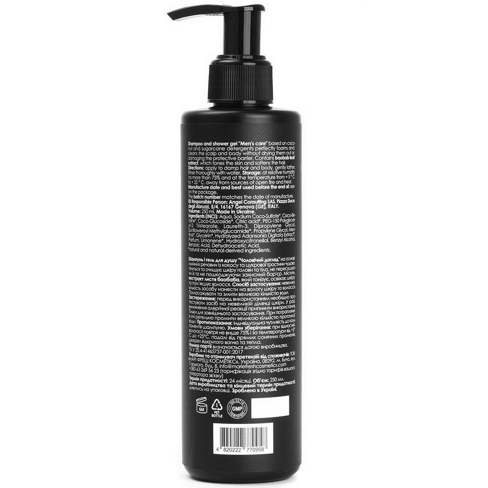 ЧОЛОВІЧИЙ ШАМПУНЬ-ГЕЛЬ ДЛЯ ДУШУ 2В1 Чоловічий шампунь-гель для душу 2в1 на основі натуральних мийних речовин з кокоса та цукрової тростини, без агресивних сульфатів. Він чудово піниться та очищує шкіру голови та тіла, не пересушуючи їх та не пошкоджуючи захисний бар'єр при цьому. Містить екстракт ферментованих листів баобаба, який допомагає забезпечити глибоку детоксикацію тіла. Глибоко очищує шкіру і волосся після занять спортом, фізичних навантажень, залишає після використання легкий цитрусово-ментоловий аромат.